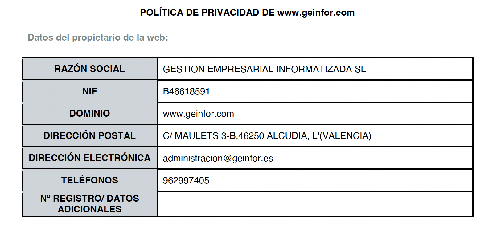 Protección de datos De conformidad con la normativa vigente y aplicable en protección de datos de carácter personal, le informamos que sus datos serán incorporados al sistema de tratamiento titularidad de GESTION EMPRESARIAL INFORMATIZADA SL con NIF B46618591 y domicilio social sito en C/ MAULETS 3-B,46250 ALCUDIA, L'(VALENCIA). A continuación, se facilita la información de los tratamientos realizados: